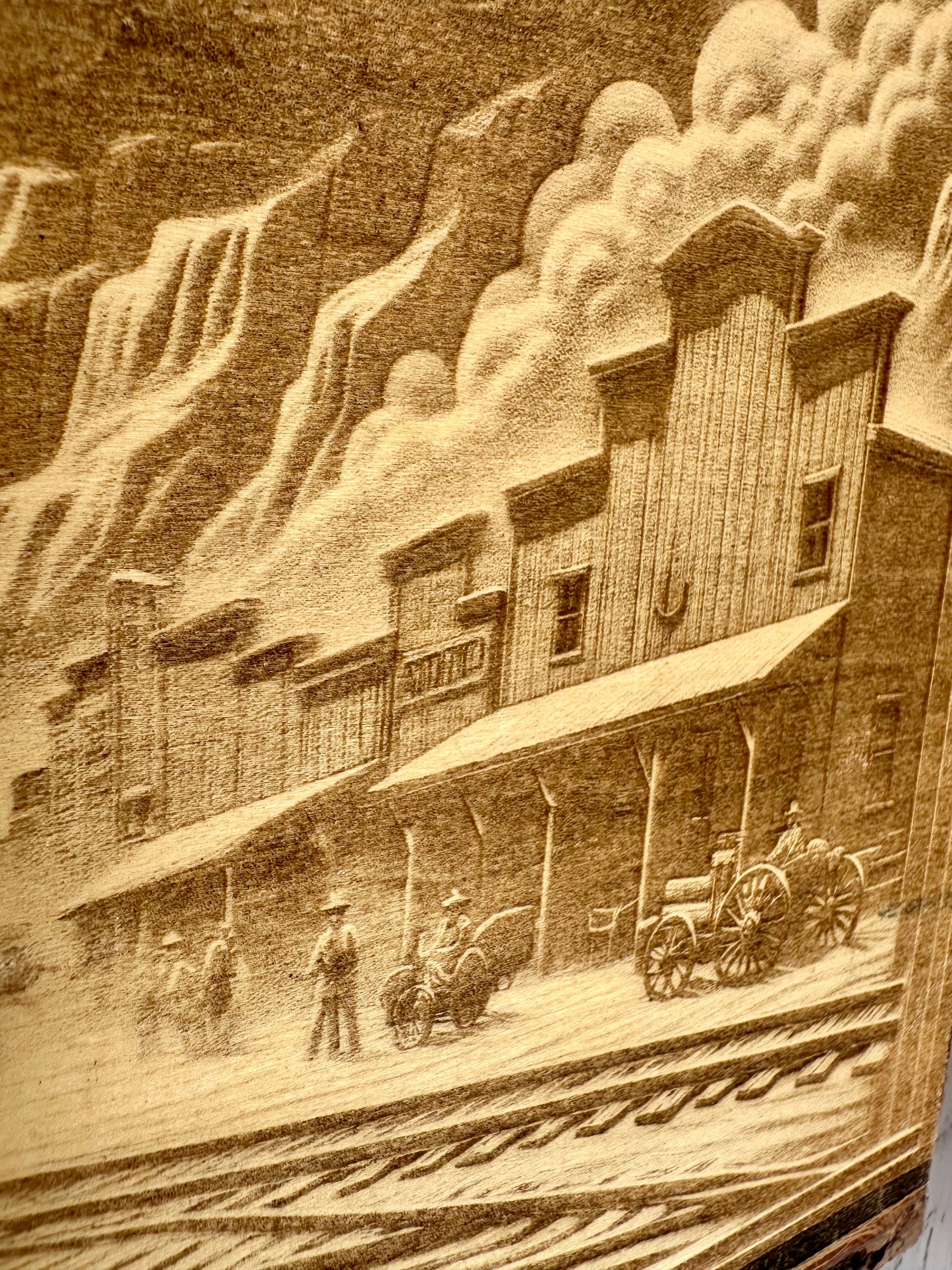 Steam Train in Western Town Live Edge Rectangular Plaque