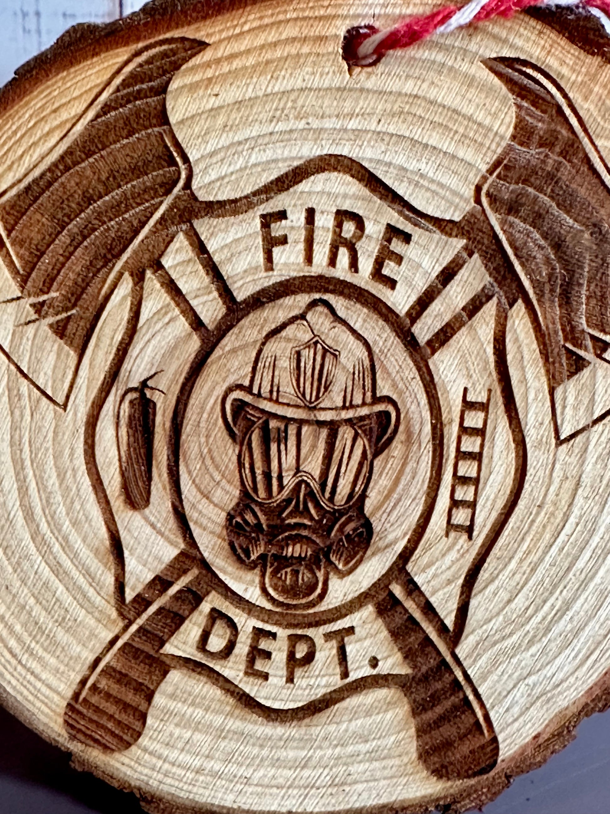 Engraved Live Edge Wooden Round Ornament - Fire Department Emblem