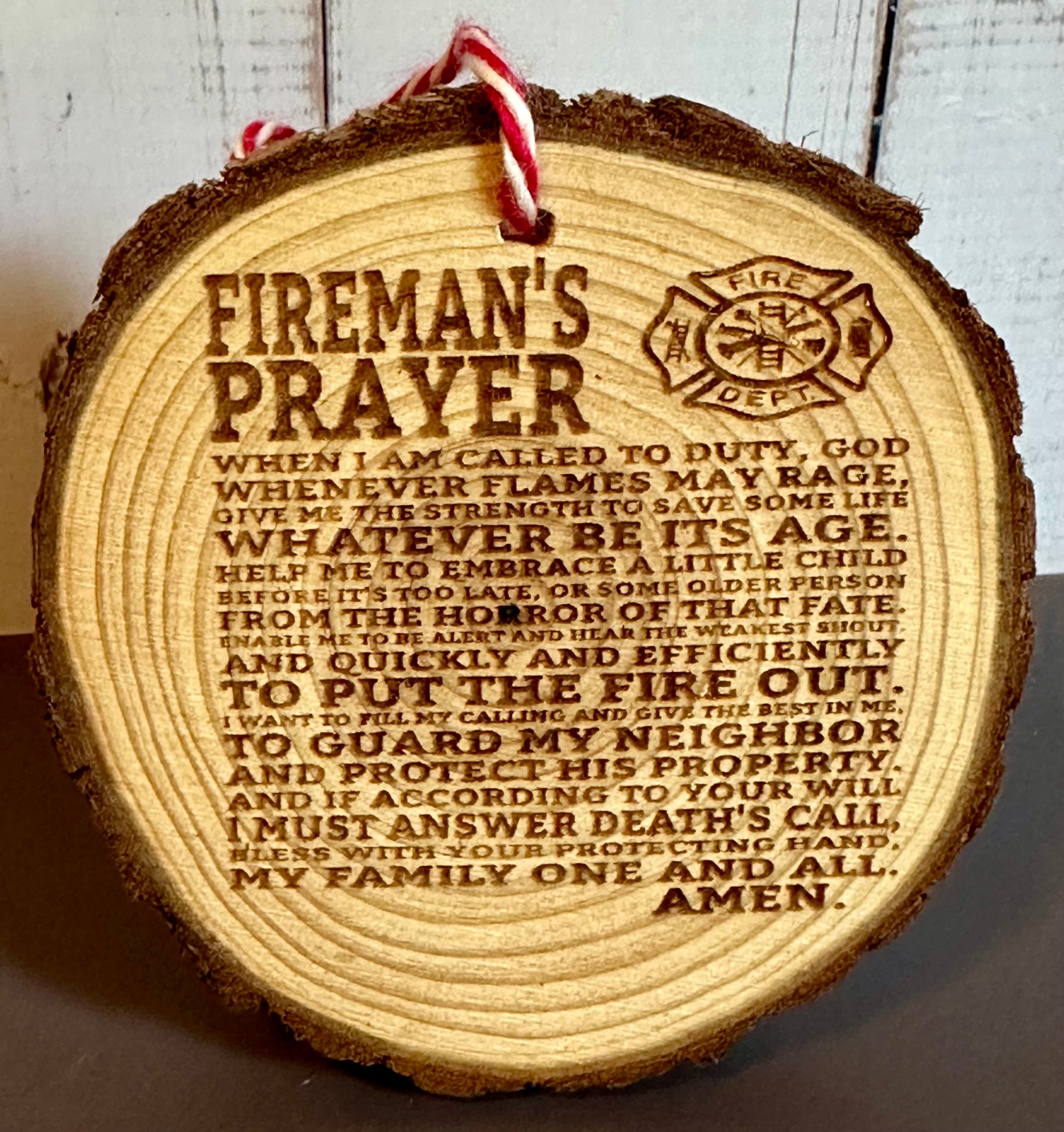 Engraved Live Edge Wooden Round Ornament - Fireman’s Prayer