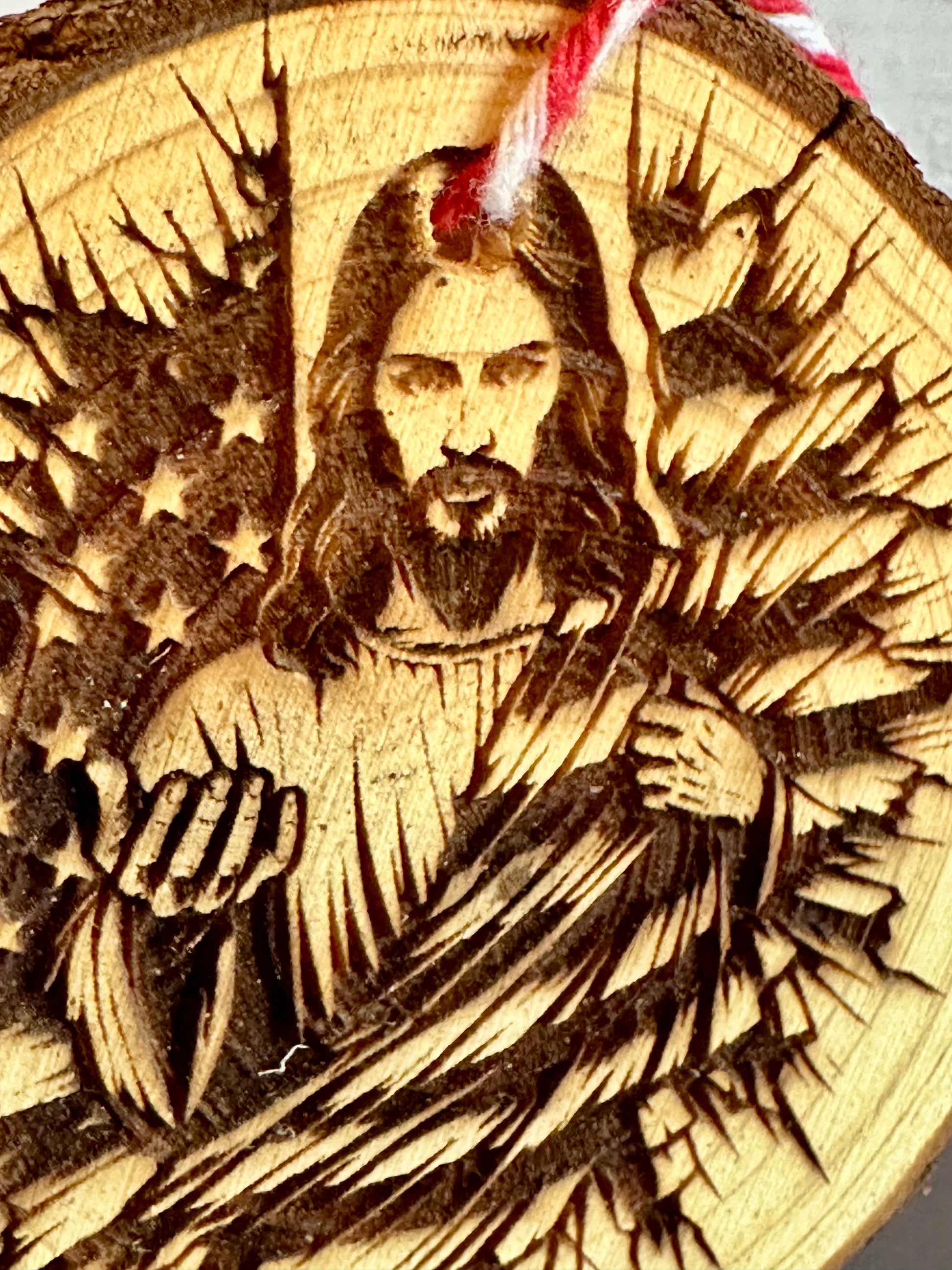 Engraved Live Edge Wooden Round Ornament - Jesus with Flag