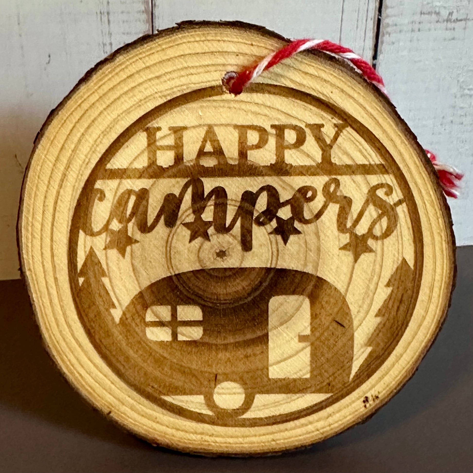 Engraved Live Edge Wooden Round Ornament - Happy Camper
